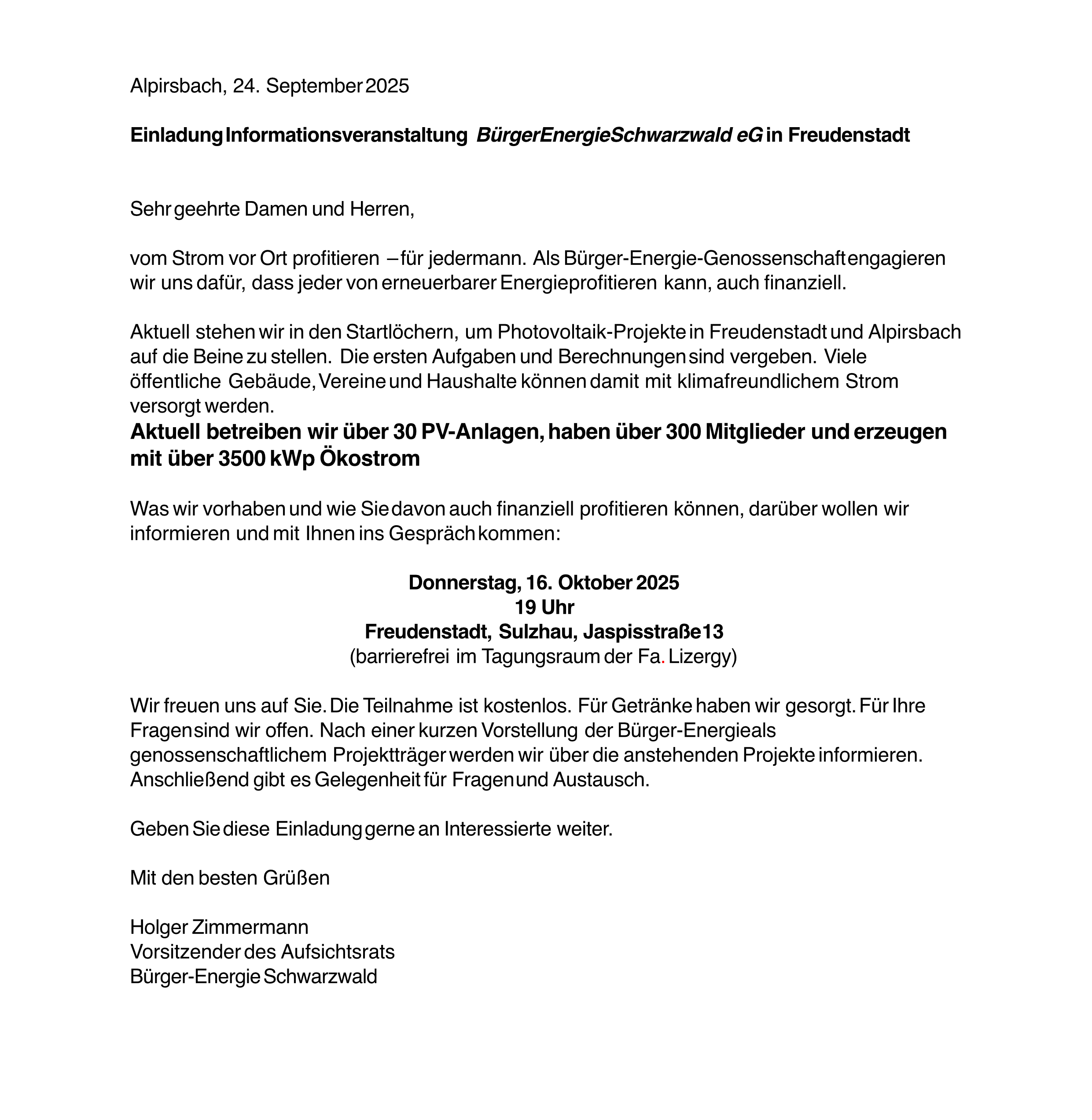 Die Bürger-Intitiative Nachhaltige Energien (BINE) in Alpirsbach war maßgeblich an der Gründung der Bürger-Energie Alpirsbach eG, kurz BEA, am 09. April 2010 beteiligt. 39 Gründungsmitglieder unterzeichneten die Satzung. Erstes Projekt war der Bau und Betrieb einer Photovoltaikanlage auf dem Dach des Penny-Marktes, das die Genossenschaft mieten konnte. Nachdem weitere Projekte in Dornhan und Lauterbach hinzukamen, sich also nicht mehr nur auf den Raum Alpirsbach beschränkte und auch etliche Mitglieder aus den neuen Projektstandorten hinzukamen, beschloss die Mitgliederversammlung 2013 eine Umbenennung der Bürger-Energie Alpirsbach eG in die Bürger-Energie Schwarzwald eG, kurz BES. Bisher haben wir 1 MW Photovoltaik gebaut und sind aktuell dabei, weitere erneuerbare Energie aus Wind und Wasser zu erschließen.